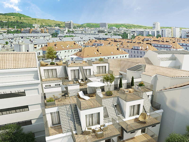 Der schlichten Fassade wurde durch eine horizontale Fensterfront und zwei, dem Dach entspringenden, lichtspendenden Einheiten eine neue visuelle Struktur verliehen, welche die Höhe zusätzlich an die benachbarten Gebäude angleicht und den Straßenzug vereinheitlicht wirken lässt. Bei der Gestaltung der Terrassenflächen hat sich Architekt Martin Haas etwas Besonderes einfallen lassen: Die vertikale Abstufung der einzelnen Gebäudeteile und der damit einhergehenden Niveauunterschiede der Freiflächen lassen die optimale Nutzung der südöstlichen Lage zu und sorgen zeitgleich für ein größtmögliches Maß an uneinsehbaren Rückzugsorten. Hier kann man, auch dank des freien Blickes, welcher die niedrige Remise bietet, den Tag wunderbar ausklingen und die Sorgen des Alltags vergessen lassen.