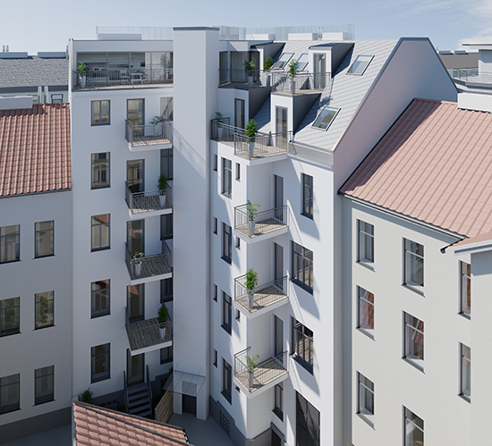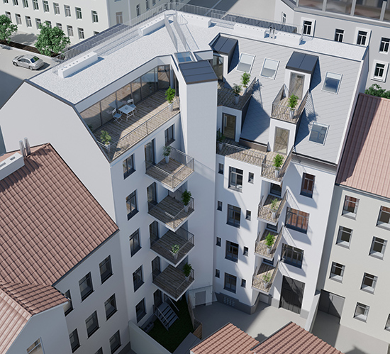 Der verschlafene Innenhof bietet eine willkommene Abwechslung zu dem Lärm der Stadt und mit ihren großzügig angelegten Terrassen laden die Wohnungen zu einem fantastischen Rundumblick über Wien ein, bei dem man seine Gedanken schweifen lassen kann. Ein eigens gebauter Liftschacht sorgt für ein problemloses Erreichen aller Ecken dieses Gründerzeithauses auch nach einem schweren Einkauf oder für Menschen mit Einschränkungen.