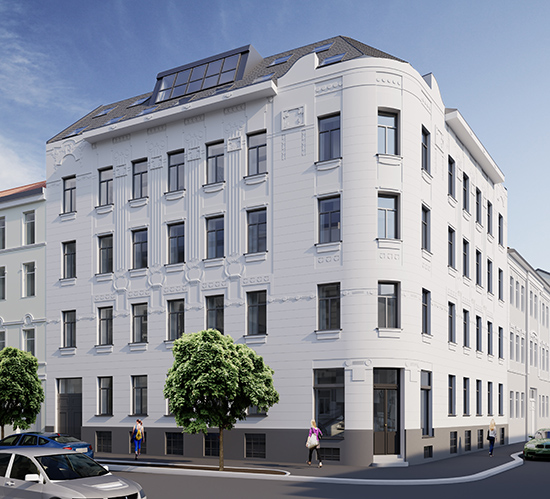 Die wunderschöne Fassade mit ihren detailverliebten Verzierungen wurde komplett restauriert und in ihrem Charme erhalten. Konterkariert wird dieses liebliche Erscheinungsbild von dem zeitgemäßen Dachgeschossausbau mit großer, gläserner Fensterschräge die für eine hervorragende Lichtdurchflutung der oberen Wohnungen sorgt.