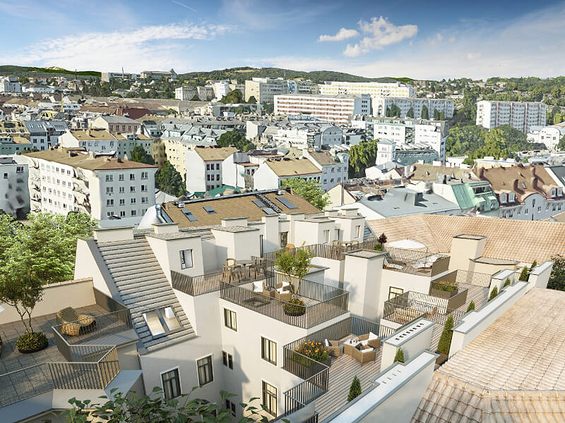 In der wunderschönen Heurigengegend im sechszehnten Gemeindebezirk findet sich die optimale Kombination aus Naturverbundenheit und Stadtgetümmel wieder. Hier in der Arnethgasse entstand aus einem Gründerzeithaus eine moderne Wohnanlage mit Penthouse Wohnungen im Dachgeschoss.