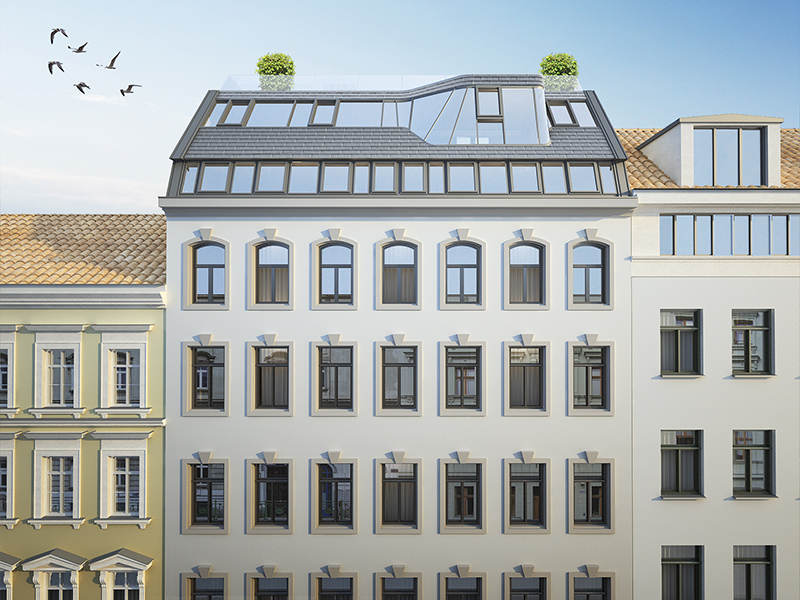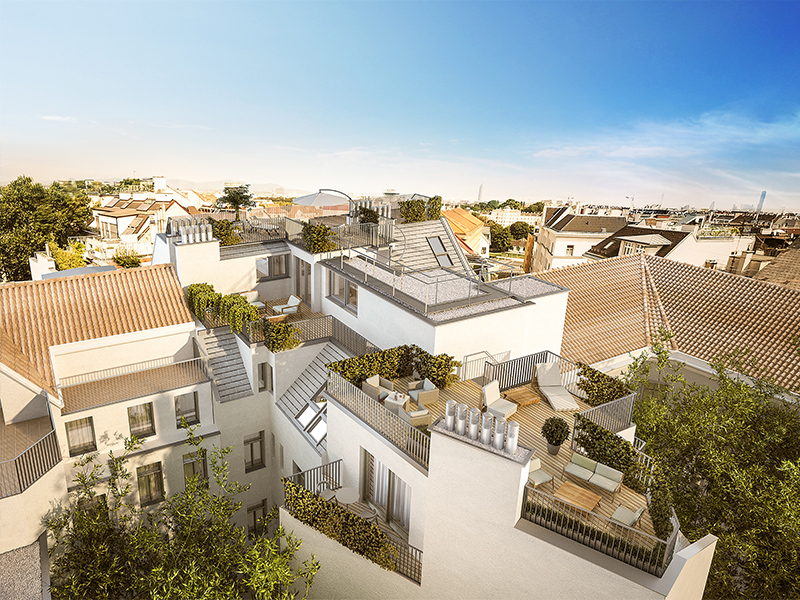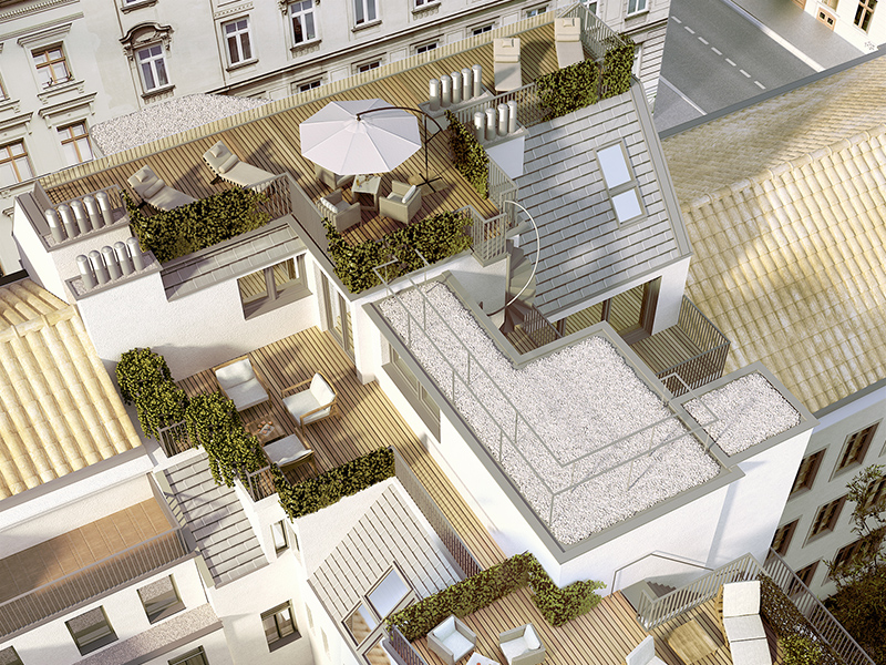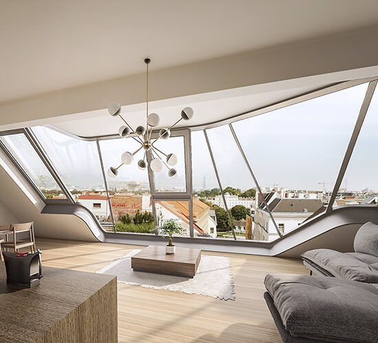 Während die schlichte Fassade mit dekorativen Fensterumrahmungen in das historische Stadtbild zurückgeholt wird, liegt den geschwungenen Linien des asymmetrischen Dachaufbaus der inspirative Zauber der Zukunft inne. Die großzügig konzeptionierten Glasflächen der neu geschaffenen Penthouse Wohnung gewähren einen freien Blick über die Häuser der Stadt hinweg bis zu dem wunderschön grünen Augarten, wodurch es gelingt, das volle Potential dieses einzigartigen Standorts zur Gänze auszuschöpfen. Zusätzlich kann die verkehrsberuhigte Lage dank der im Rahmen der Arbeiten, durch das Abtragen des Giebeldachs, erschaffenen Terrassenflächen in den warmen Monaten bestens genutzt werden, um zu Entspannen und die Sorgen zu vergessen.
