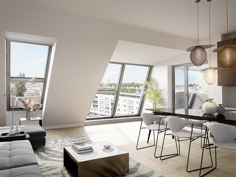 Architekt Martin Haas ist es mit raffiniertem Geschick gelungen diese Herausforderung überragend zu meistern. Einerseits können die neu entstandenen Penthouse Wohnungen mit einer großen Fensterfront, welche den Blick über die Stadt ermöglicht, punkten. Andererseits gelingt es durch die kreative Verwendung einer Balkenüberdachung ebenfalls die heißen Sommermonate im Schatten verbringen zu können, ohne auf wohltuendes Licht im Innenraum verzichten zu müssen.