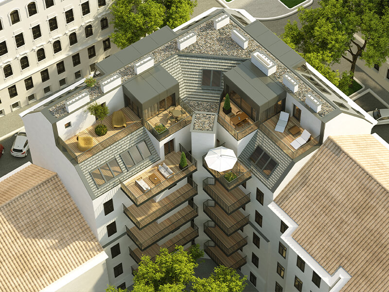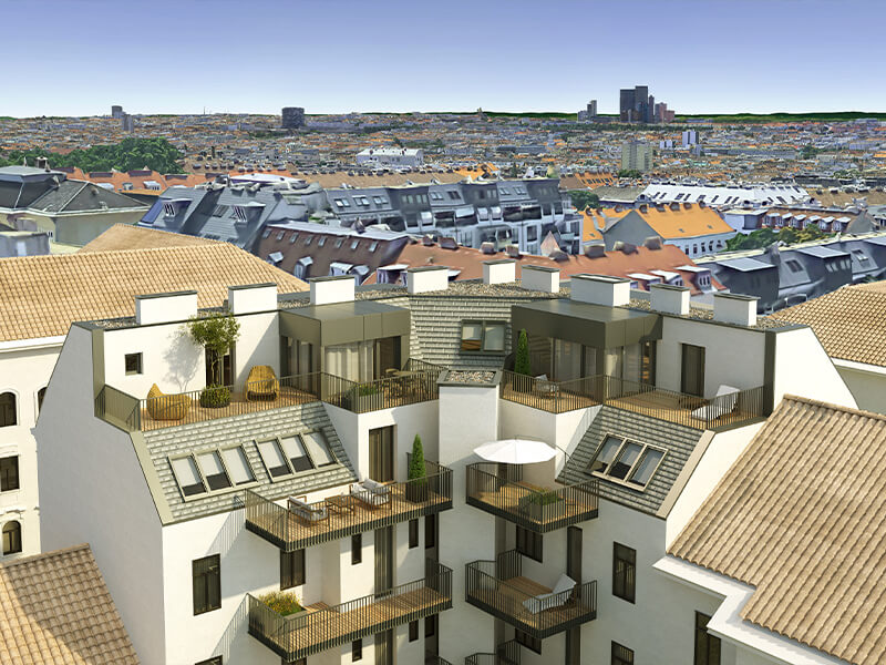 Das Haus besticht nicht nur durch einen ausgesprochen eleganten straßenseitigen Anblick, sondern schafft auch im Innenhof lebenswerten Wohnraum mit Balkonflächen, welche ausreichend Platz bieten um eine Atmosphäre der Entspannung zu erzeugen. Ein besonderes Highlight ist die geschickt platzierte Terrasse im Eck des Hauses, auf der ein herrlicher Blick über die Dächer Wiens bei gleichzeitig ungestörter Privatsphäre genossen werden kann.
