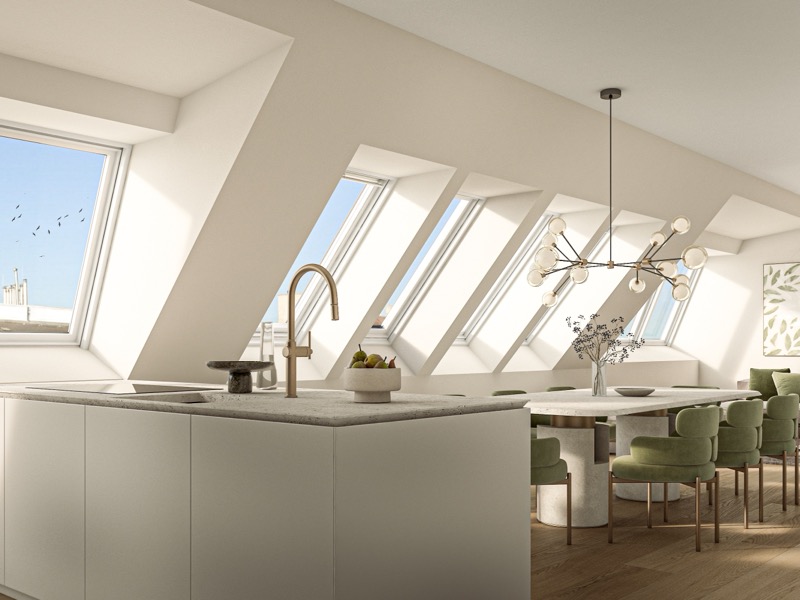 Licht wird zum Hauptakteur in den neuen Wohnräumen der Schönbrunner Straße 60. Durch skulpturale Dachfenster flutet es in die offene Küche, verwandelt den Wohnbereich in eine lichtdurchflutete Bühne und taucht das Schlafzimmer mit seinem begehbaren Ankleidebereich in sanfte Helligkeit. Jeder Raum ist als eigenständige Komposition gedacht, in der Material und Proportion ein subtiles Gleichgewicht eingehen.