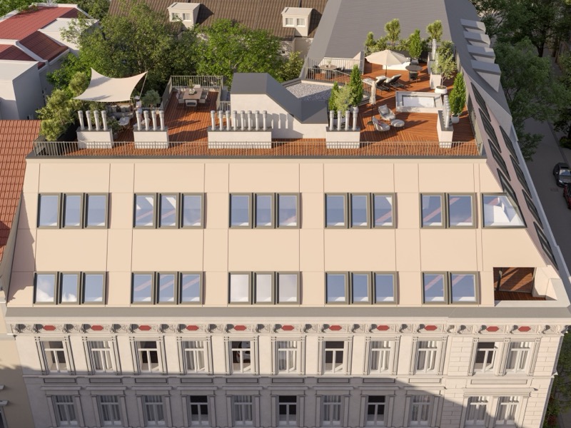 Weitläufige Dachterrassen, die sich über mehrere Ebenen staffeln, Sonnensegel über begrünten Freibereichen, der Himmel über Mariahilf als ständiger Begleiter. Was der Dachgeschoßausbau an der Otto-Bauer-Gasse 17 verspricht, ist nichts weniger als eine neue Art des urbanen Wohnens. Von der Straßenecke aus betrachtet, verschmilzt die zeitgenössische Dachlandschaft mit der bestehenden Kubatur, als hätte sie schon immer dazugehört. Erst aus der Vogelperspektive offenbart sich das ganze Ausmaß des Entwurfs.